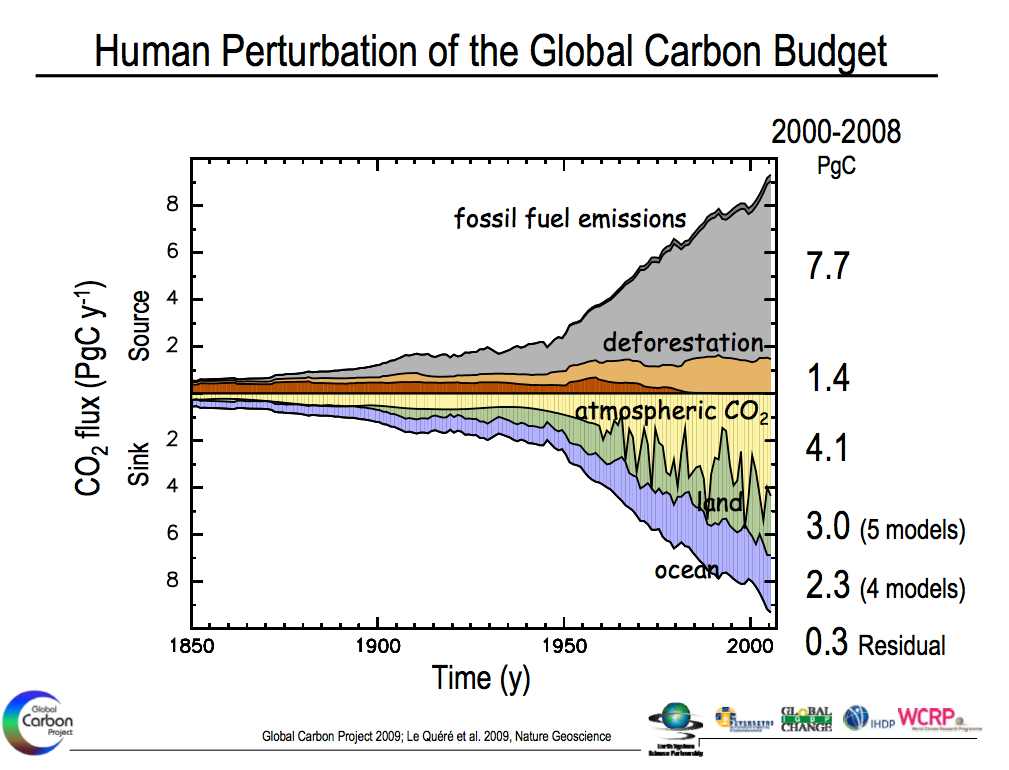 I’m not sure what the proximate cause of lowered percent uptake by the sinks; I imagine there is some marginal saturation effects, and ocean surface temperature, for example, influences carbon uptake rates (e.g. cold water uptakes more carbon).
