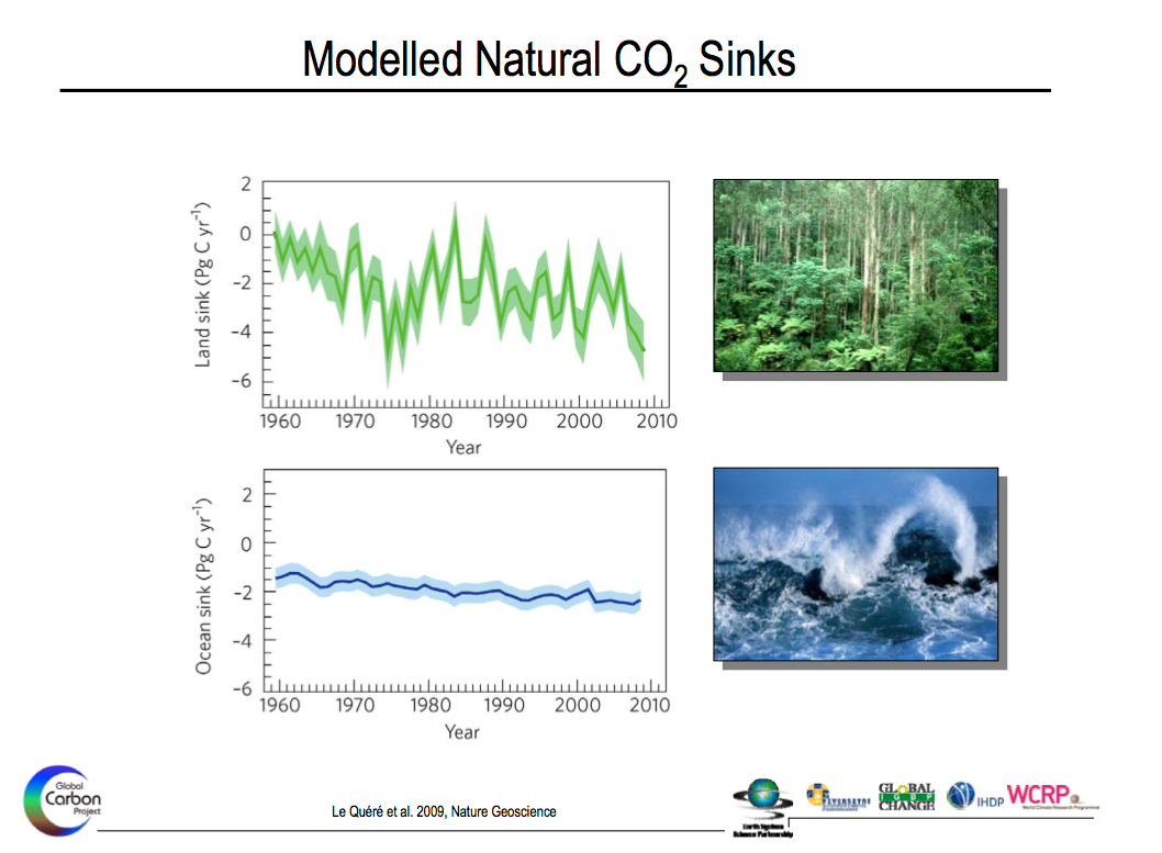 The Global Carbon Project has some interesting data on both land and ocean sink efficacy, as well as overall carbon flows: