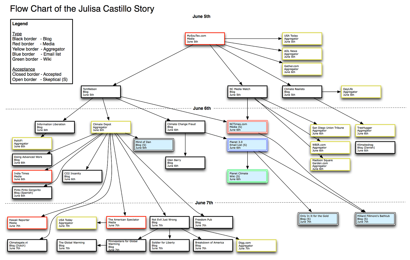 For those who haven’t bumped into it yet, there was a bit of a tempest-in-a-teapot when a story came out about a 4th grade girl who had purportedly won an award from the National Science Foundation with a project titled “Disproving Global Warming”. While some good investigative sleuthing by Michael Tobis revealed it to be an elaborate hoax (involving a forged letter from an official at the National Science Foundation, as well as a plaque, trophy, and medal), it nevertheless serves as an interesting exercise in tracing the flow of news though the climate blogosphere. Tracing the story from its original source, we find that it was covered by about 40 sites of various types prior to being revealed as a hoax, though there were some early skeptics of the validity of the story. It also reveals how influential Climate Depot (who featured the story prominently) can be in spreading information.