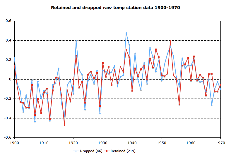 Working on writing up something more detailed on the whole “cold stations deleted” meme, but here is some food for thought in the mean time: a chart of raw data from all stations with a continuous 1900-1970 record that were removed post-1970 and those that were not removed post-1970. If the stations removals were chosen to leave a warm bias in the remaining stations, you would have expected a fair bit of divergence prior to removal (as it would be the criteria for removal). Looks to me like they track pretty well.