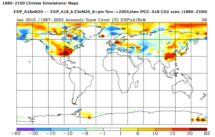 24. Actually, I was looking at the wrong map. Model E predicts little net change in East Coast snow in the next 10 years, though some individual months have high anomalies.