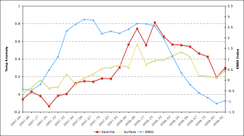 Here are surface and satellite temps compared to the ENSO index during the 97-98 event, for reference: