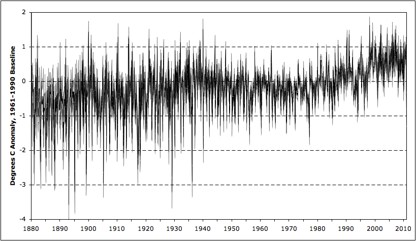 If the errors in the monthly anomalies are serially uncorrelated, the trend estimates will be much more precise than the spread of the individual monthly anomalies might imply.