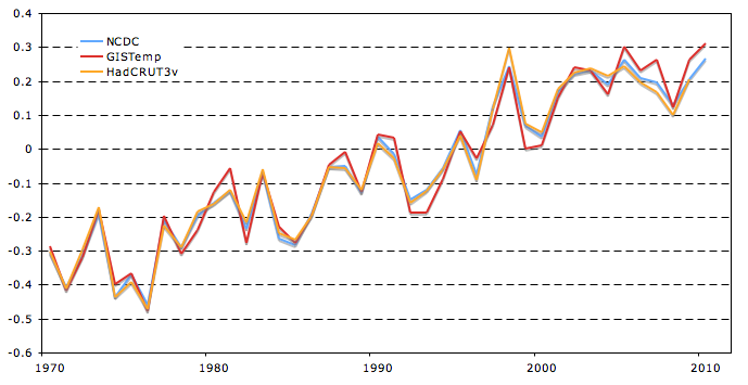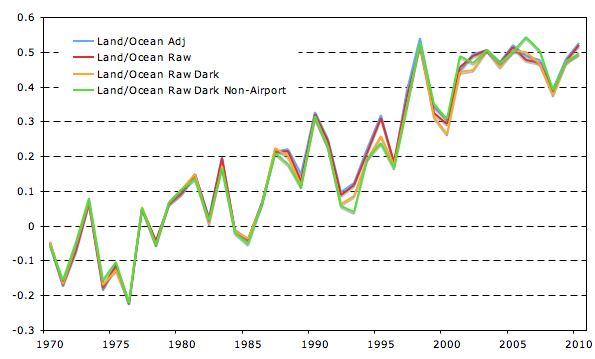 Crying adjustments won’t really help much. Take raw GHCN and any SST series you like and you will still get 2010 tied for hottest within sampling error. You can even eliminate all urban stations or airport stations and you get effectively the same results: