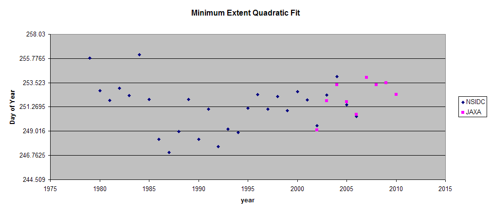 Nope. I’ve done it with both extent and area. The absolute minimum data is very noisy. It’s highly questionable to justify your 10 day shift using a linear trend that isn’t even close to being significantly different from zero. As I posted earlier, I used a quadratic fit of NSIDC and JAXA extent data, which has much less noise and still didn’t see a statistically significant trend in the minimum date. Those data are clearly not linear.