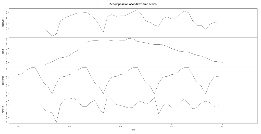 I ran the monthly NOAA extent anomaly figures for 1/2007-7/2011 through the decompose function in R.