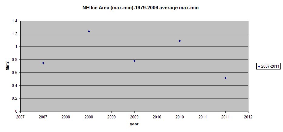 I don’t see that there is any more real information than plotting the 2007-2011 (max-min)-1979-2006 average max-min (in this case area rather than extent).