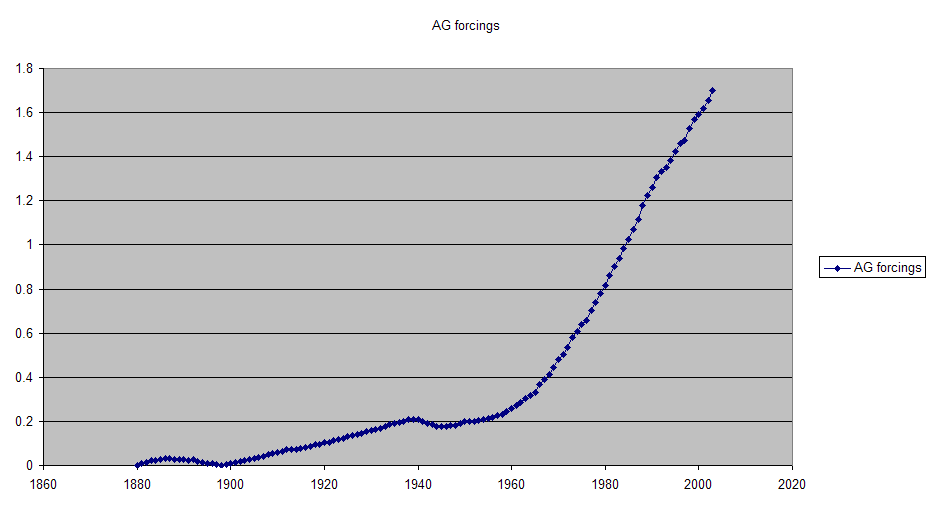 I second Carrick on the AG forcings prior to 1960 being at the noise level. The IPCC estimates of uncertainty for anthropogenic forcings other than WM ghg’s are very high. Even ghg’s are +/- 10%. I consider it very likely that if error bars were attached to those forcing numbers, they would include zero until after 1960. I’d do it myself, but it’s not worth the effort.