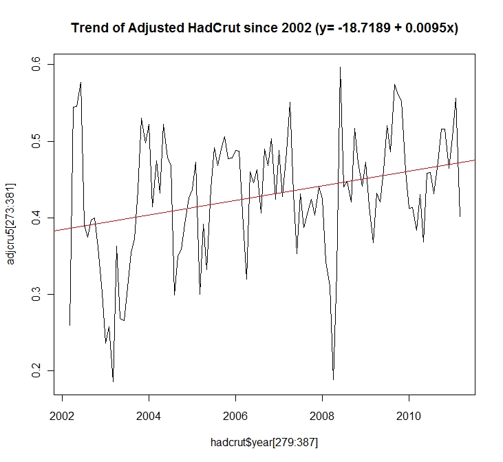 So, he comes back a year later, does a quick, simple calculation just looking at the HadCRUT temperature trend which most HadCRUT people use (eg, the variance adjusted one), sees significance, and sees an opportunity to maybe start correcting a widespread misconception regarding his original statement.