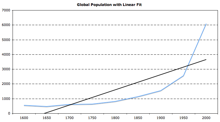 For example, if I had data showing an exponential increase (say, global population from 1600 to present), would the cumulative change be best estimated by a linear trend or a comparison of smoothed start and end points? E.g. is the change in global population between 1600 and 2000 better characterized by 4 billion or 5.5 billion?