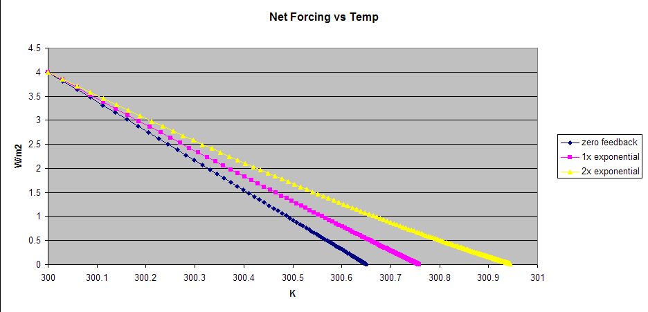Actually, if the feedback is linear with temperature, the response stays linear. However, if the feedback is non-linear with temperature, the response is non-linear as well. Here’s a simple example. The feedback is an exponential function of the change in temperature, specifically K*(EXP(ΔT)-1)/(EXP(1)-1) where K = 0,1 and 2. The forcing is calculated at the surface so the climate sensitivity is about half what it would be if calculated at the TOA. It’s a one box model with the box well mixed. This isn’t a very good feedback model as it blows up if you increase K to much greater than 2, but it illustrates the point that a non-linear feedback produces a non-linear net forcing vs temperature curve even with a very simple model.