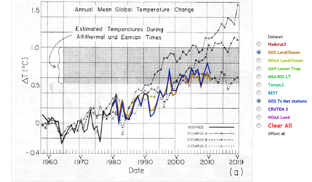As I recall looking at Hansen’s scenarios he had high levels of ChloroFluoroCarbons [CFCs] going forward and that might account for his scenarios being wrong. I think Hansen also claimed that if we ever wanted to avoid another ice age that a small plant manufacturing and spewing into the atmosphere CFCs would do the job nicely.