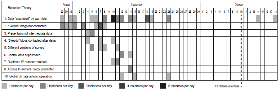 Now, consider this hypothetical: Suppose that it could be proven that Lewandowsky coordinated a veiled effort which resulted in harm to the reputations of certain skeptics. That ‘proof’, if also accompanied by unfounded speculation of intentional harm, might be one definition of Conspiracy Ideation, which afterall is what Lew believes is a property of skeptics.